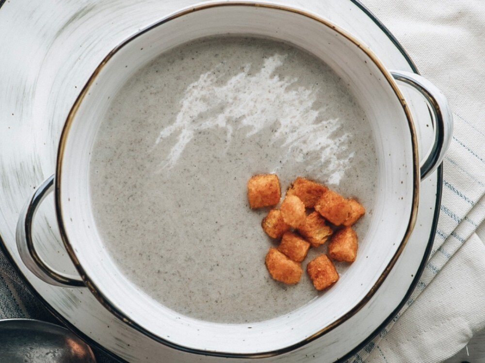 Грибы шампиньоны, лук репчатый, картофель, сливки, перец черный, масло растительное, сухарики, чеснок, паприка